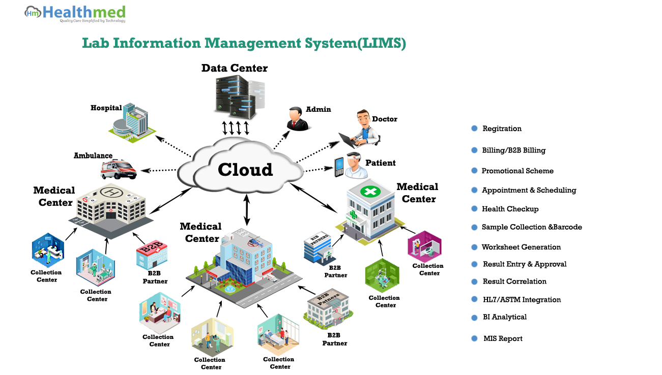 Healthmed-LIMS System is a web-based Software, which is lab information system that offers a set of key features that support a modern Laboratory operations. Those key features include — but are not limited to — workflow and data tracking support, flexible architecture, and smart data exchange interfaces, which fully "support its use in regulated environments." The features and uses of an LIMS have evolved over the years from simple sample tracking to an enterprise resource planning tool that manages multiple aspects of Laboratory informatics. It handles Registration, Billing, Sample Collection, Barcode Generation, Interfacing with Analysers, Image Capturing, Report Entry, Report Authorisation, etc. This also handles Purchase Order processing, Inventory of the Reagents and other materials.